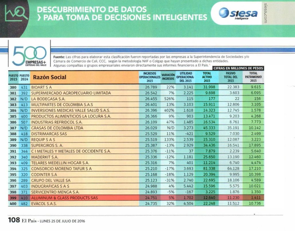 ¡Un gran logro para la empresa Aragon Aluminio! En la edición del 2016 de la revista El País, Aragon Aluminio ocupó el puesto 399 de las 500 empresas más exitosas del Valle del Cauca. Esta posición en la lista es una prueba de la confianza que sus clientes locales y internacionales tienen en la empresa, así como de las excelentes actuaciones de su equipo. Aragon Aluminio sigue en ascenso, y seguramente podrá posicionarse aún más alto en las próximas ediciones.