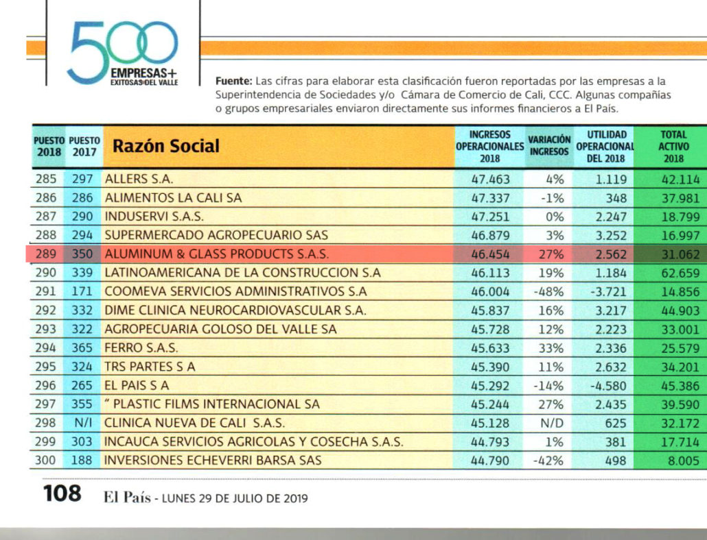 Aragon Aluminio se ubica entre las 500 empresas más exitosas del Valle del Cauca en 2018, ocupando el puesto 289. Esta posición es una clara demostración del crecimiento y la fuerza de la compañía en el mercado del aluminio en Colombia. En comparación con el año anterior, en el que ocupó el puesto 350, esta posición refleja el compromiso de Aragon Aluminio con la innovación y la mejora continua, lo que los ha posicionado como una de las empresas más competitivas del sector.