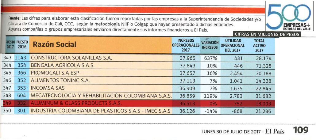 Aragon Aluminio es una empresa con una trayectoria de éxito y una presencia sólida en el mercado colombiano. Nuestra clasificación en la lista de las 500 empresas más exitosas del Valle, elaborada por la revista El País, es un reconocimiento de nuestra calidad y solidez. Algunos de los factores clave que han contribuido a este posicionamiento son la estrategia de negocios centrada en la calidad de productos y el servicio al cliente impecable.