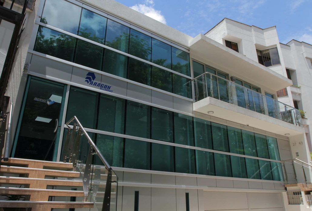 Una fachada impresionante, la Sede Cali de Aragon Aluminio. El muro cortina de vidrio insulado (termo acústico) azurlite y el panel compuesto de aluminio hacen de esta sede un edificio contemporáneo y agradable. La técnica del muro cortina permite controlar el paso de la luz, la temperatura y el sonido, brindando una gran ventaja térmicamente hablando. Además, el aluminio aporta resistencia estructural y una apariencia elegante. ¡Una combinación perfecta para un edificio de calidad!